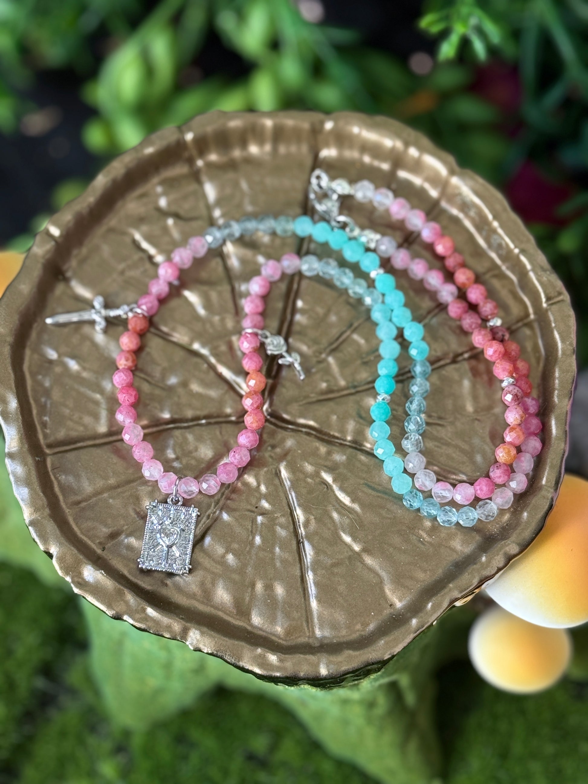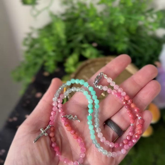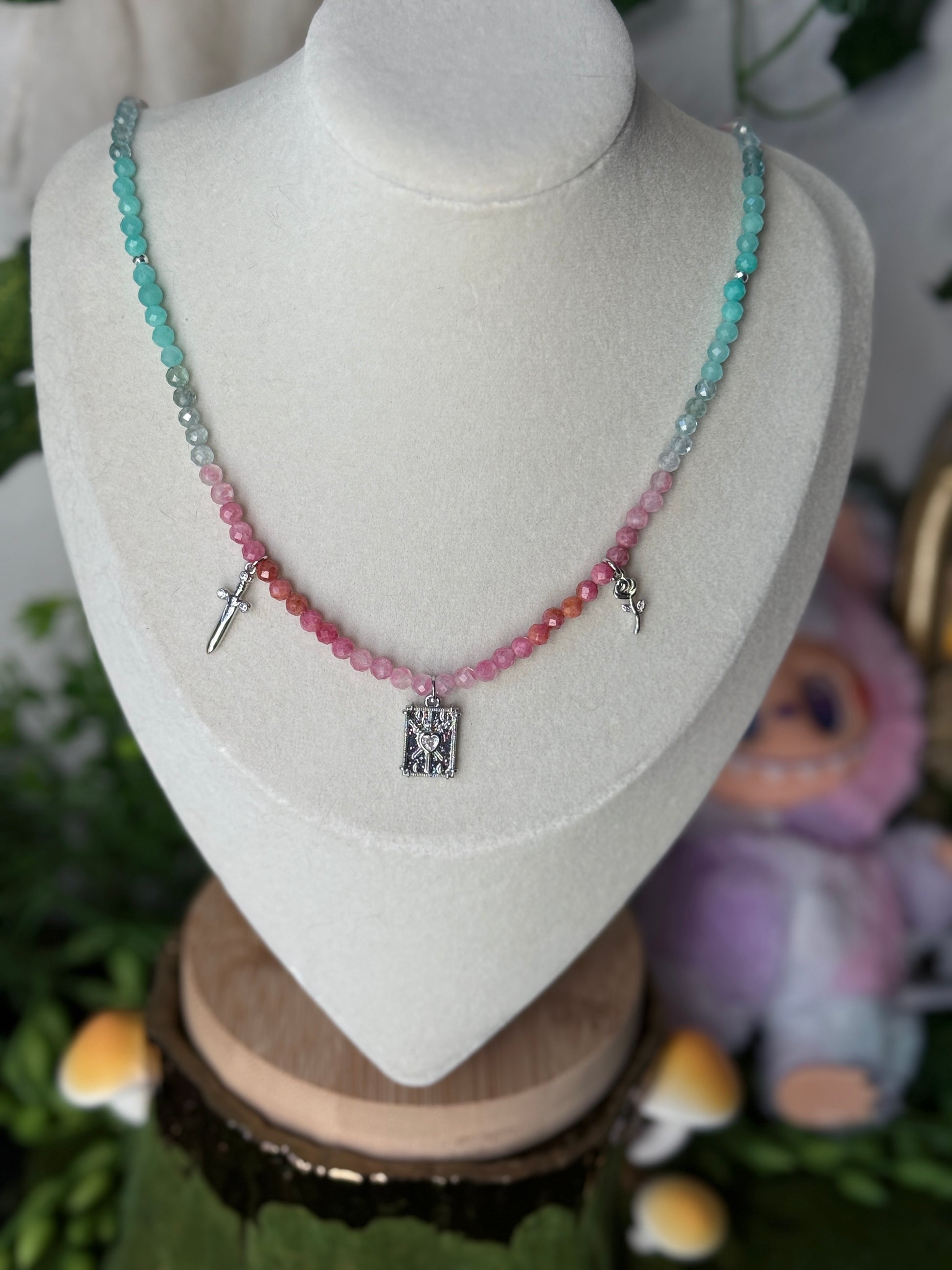 This stunning Choker features Rhodonite, Thulite, Amazonite, Apatite, silver plated Hematite Spacers, a silver Sword charm, a silver rose charm + is finished with a silver 3 of Swords Tarot Card charm. Choker is 19 inches.