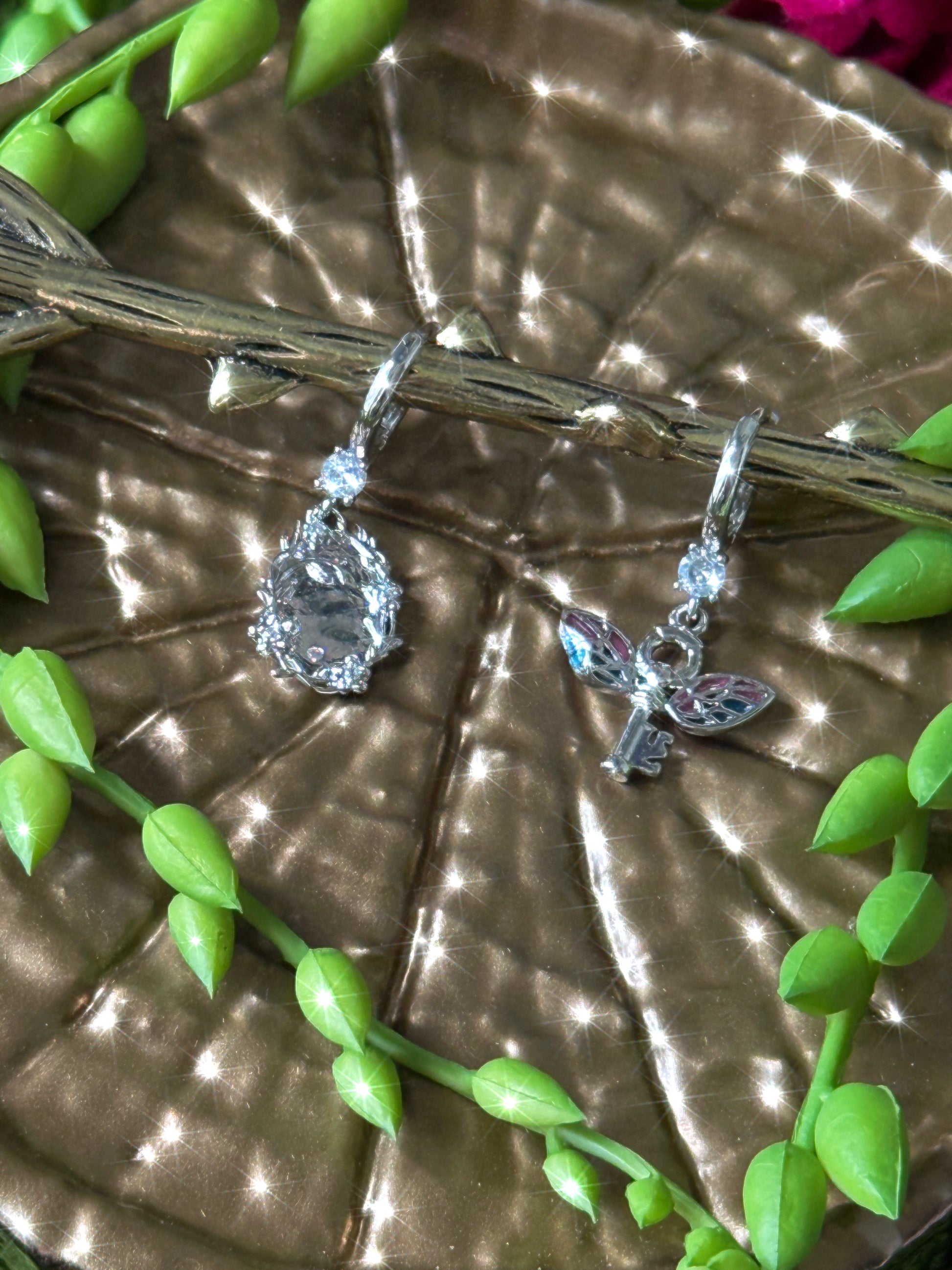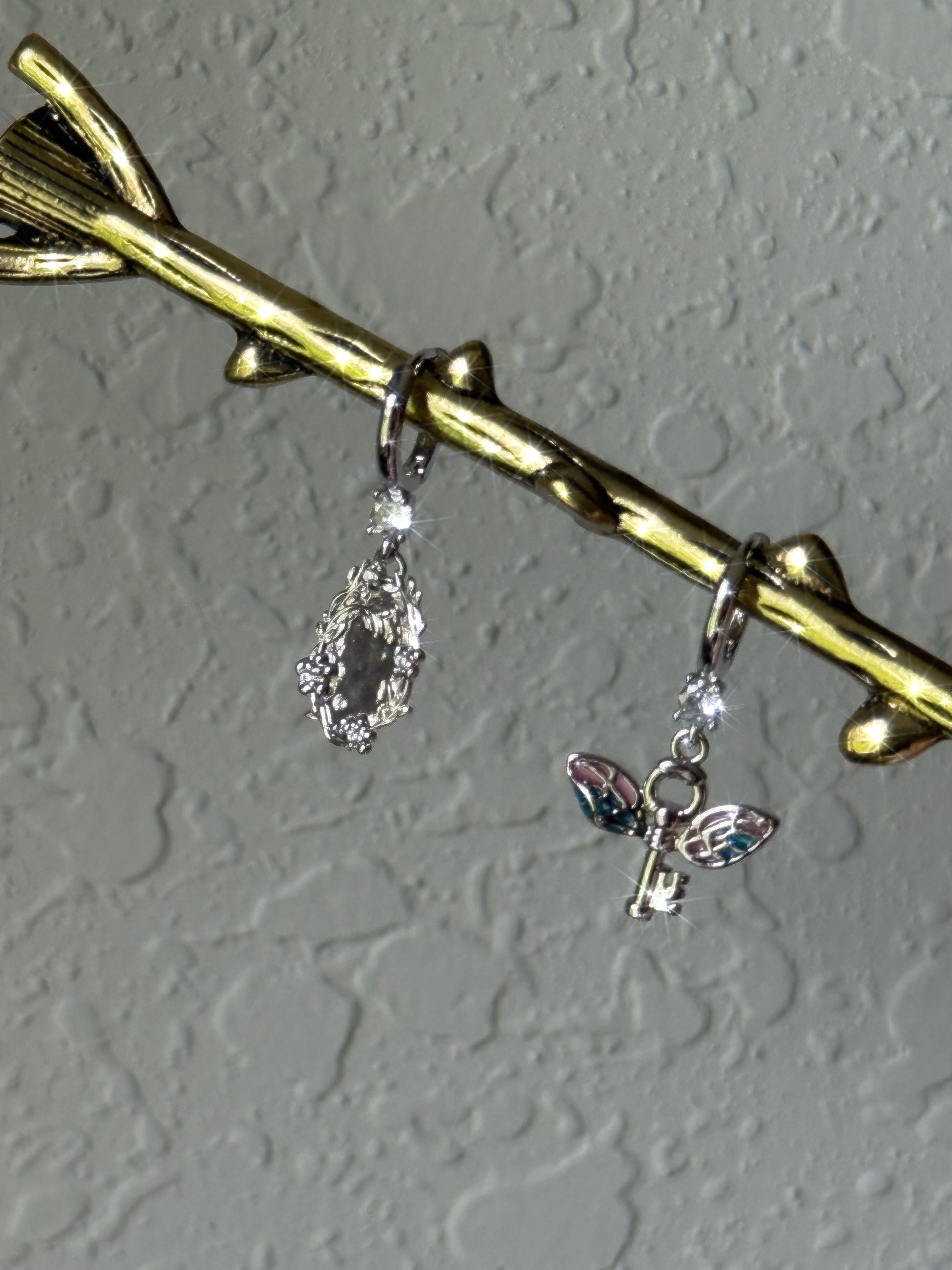 The Fairy Portal Huggies are symmetrical featuring a silver winged key charm and a fairy portal charm suspended from 12mm cubic zirconia Huggies. ✨Huggies are nickel + lead free.
