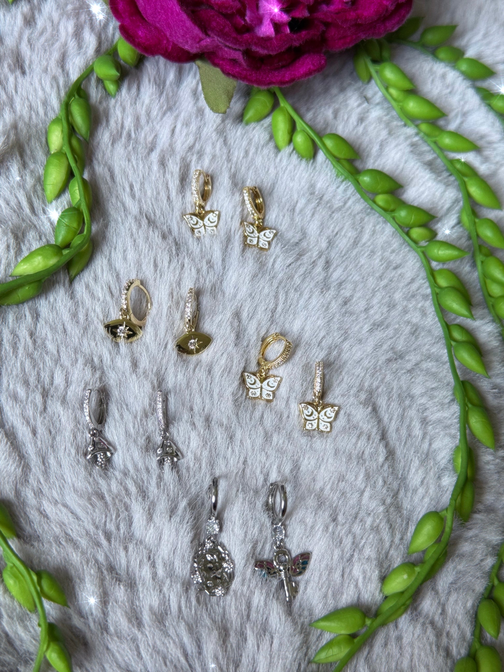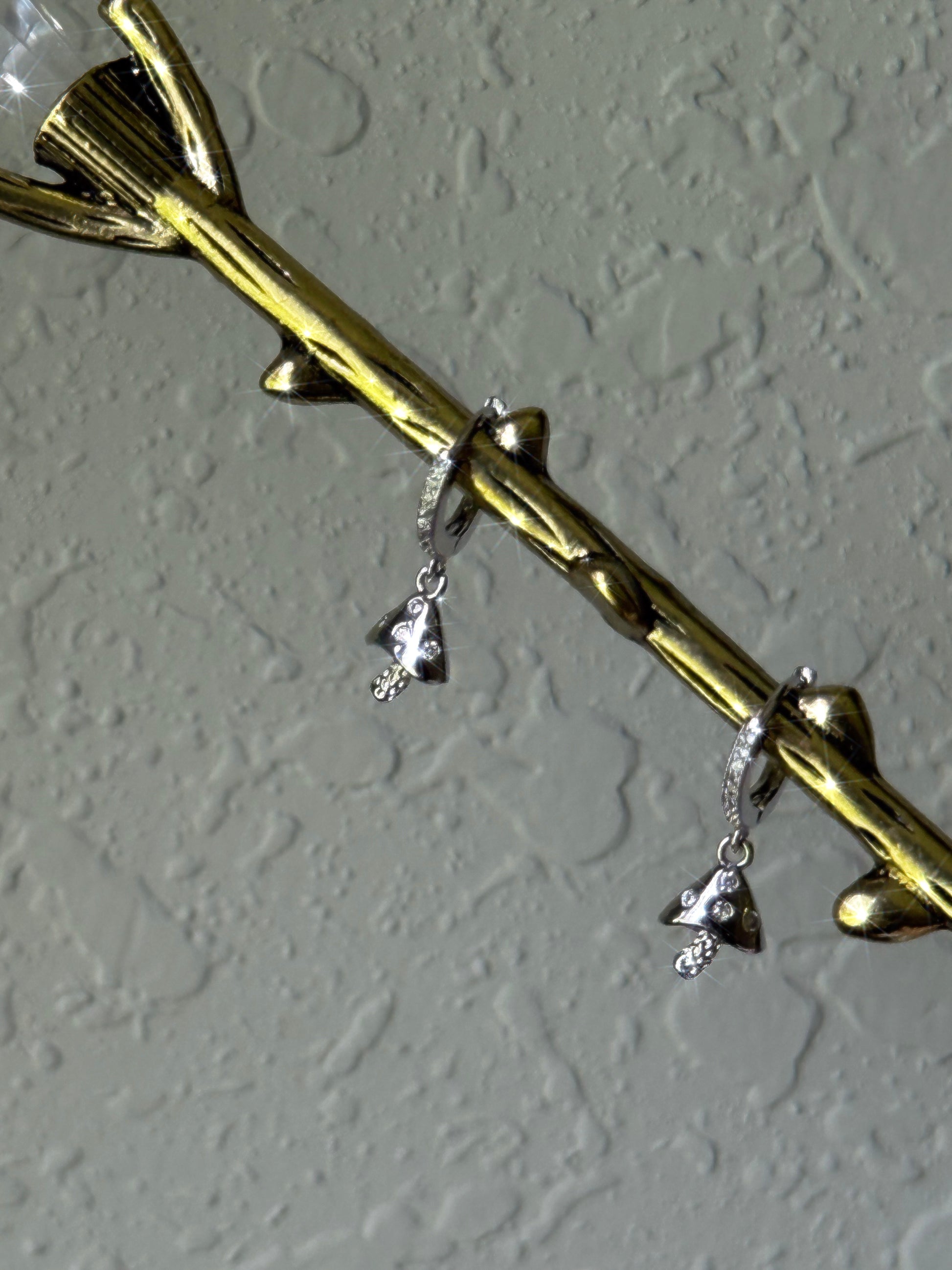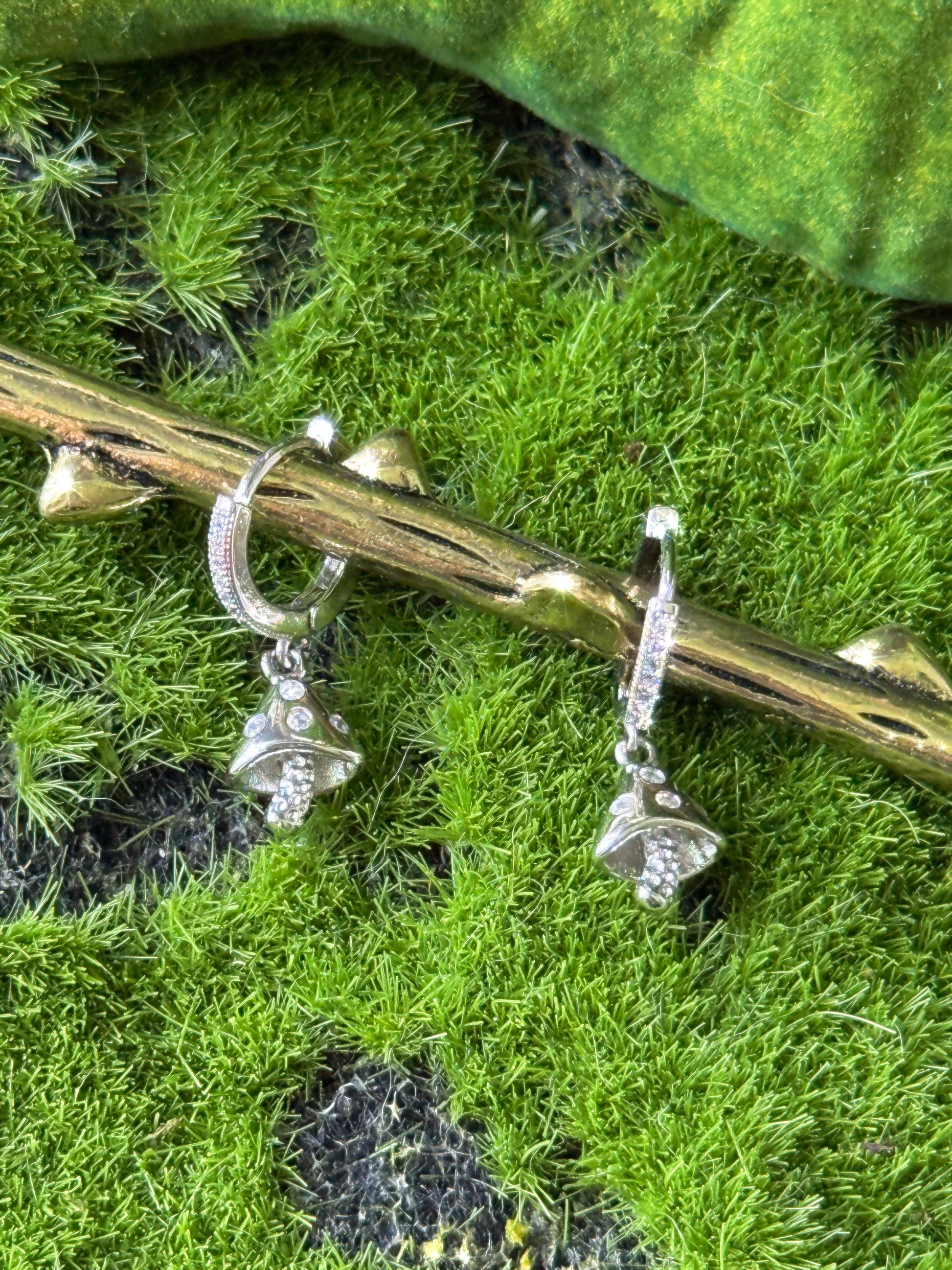The Mini Mushi Huggies feature Silver Micro Pave mushrooms suspended from 12mm cubic zirconia micro pave Silver Huggies. ✨Huggies are nickel + lead free.