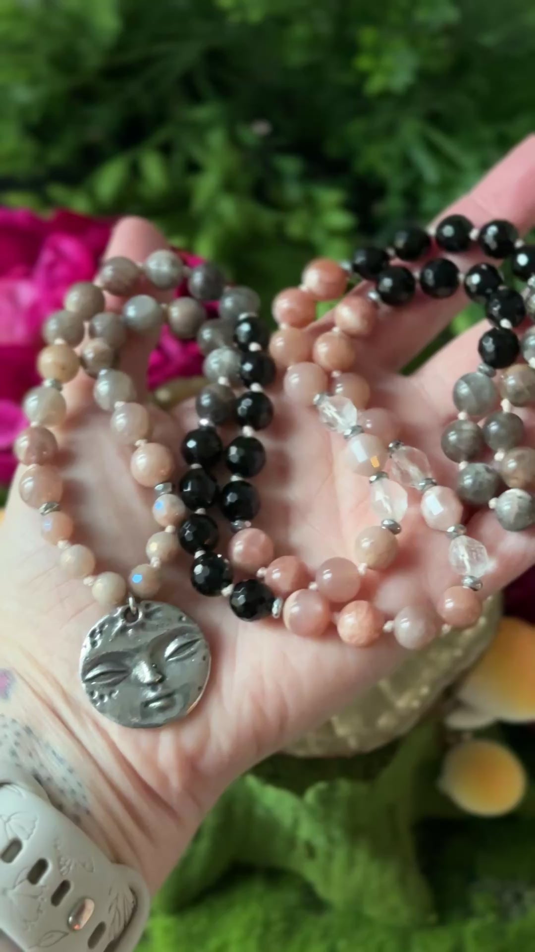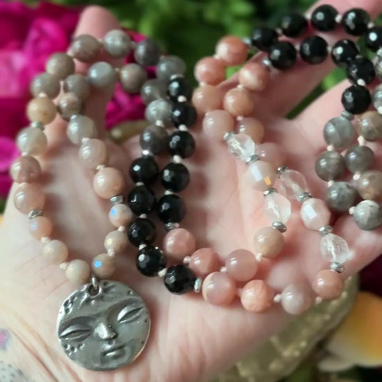 This Moon-Kissed necklace is 90 beads of Peach Moonstone, Black Sunstone, Black Onyx, Clear Quartz, and is finished with double sided Pewter Moon pendant that has a face on one side and the surface of the moon on the other.