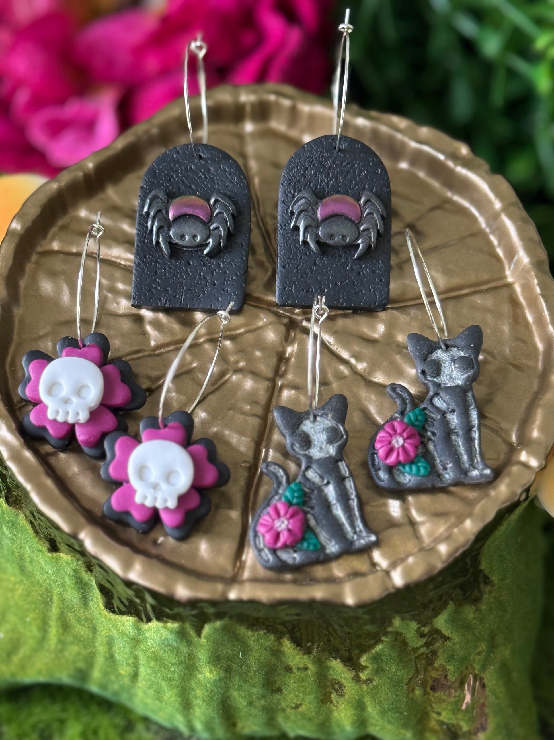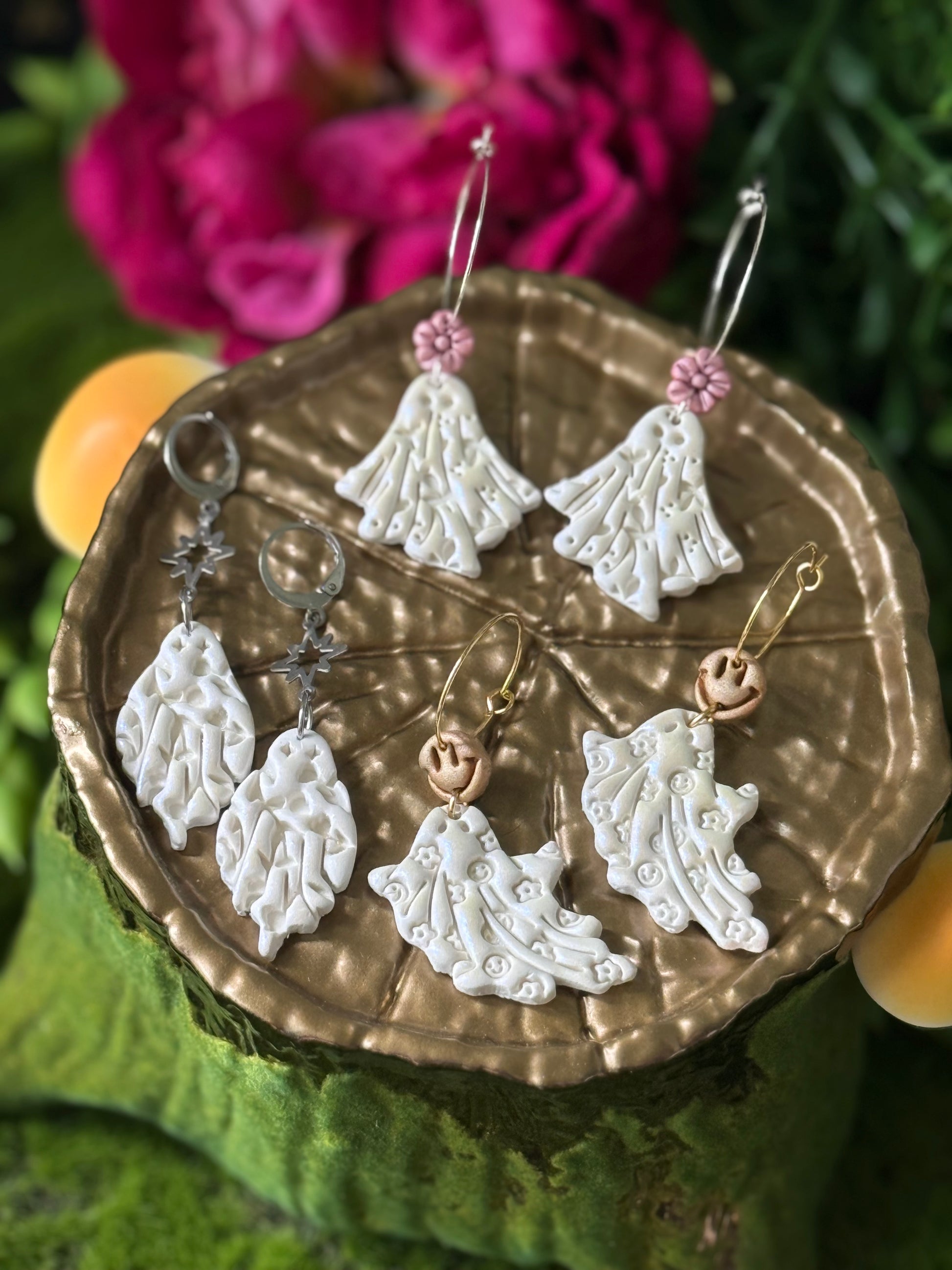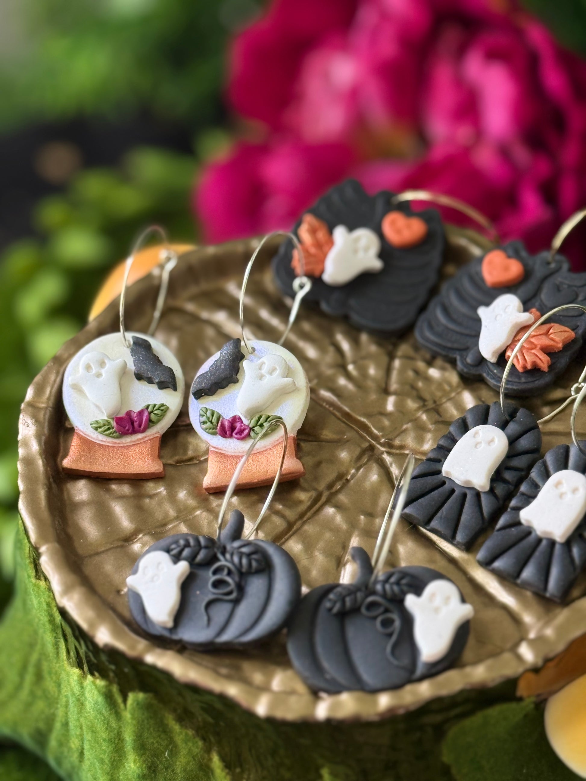 Each Boo Bag 👻 holds one pair of handcrafted spooky clay earrings, chosen at random from 10 exclusive designs inspired by the spirit of the season - think pumpkins, ghosts, bats, + a touch of enchantment.