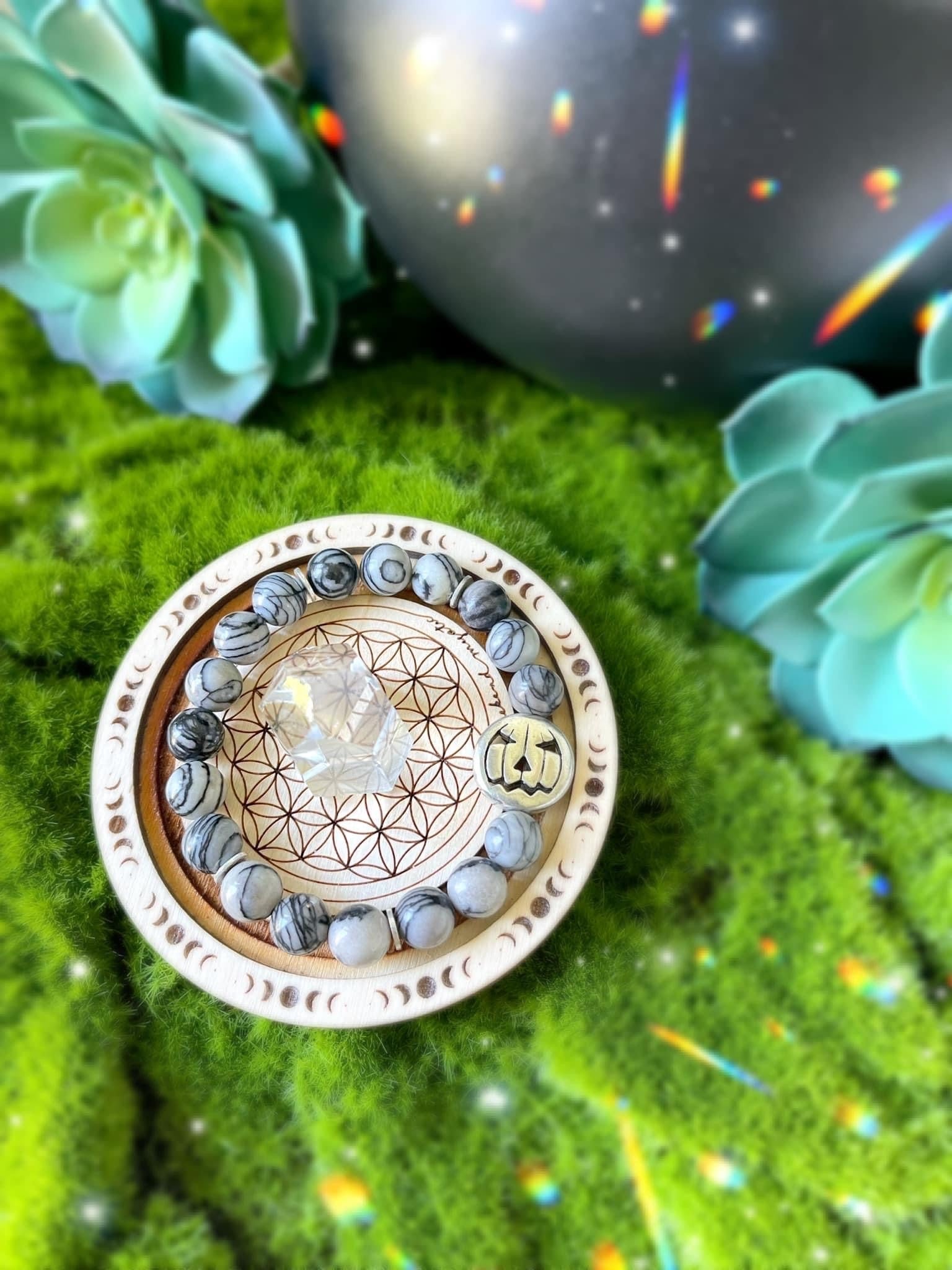Created with Spiderweb Jasper + an antique silver toned Jack-o’-lantern bead. 🎃