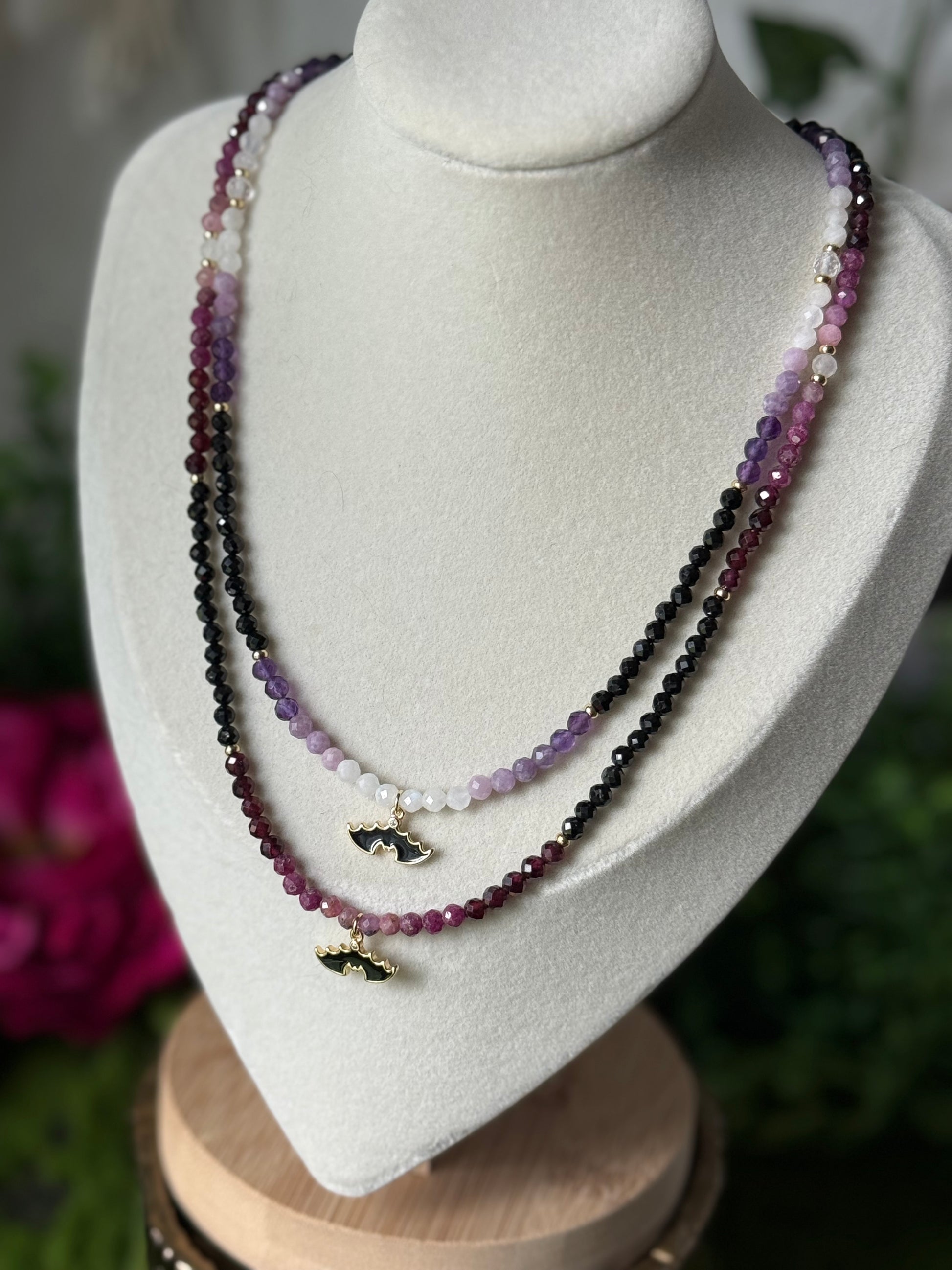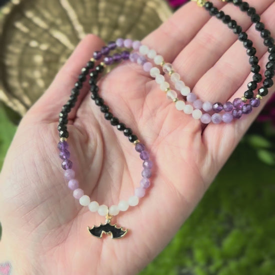 This stunning Choker features Black Spinel, Lepidolite, Amethyst, Rainbow Moonstone, Clear Quartz, Brass Spacers + a gold filled bat charm. Choker is 18inches.